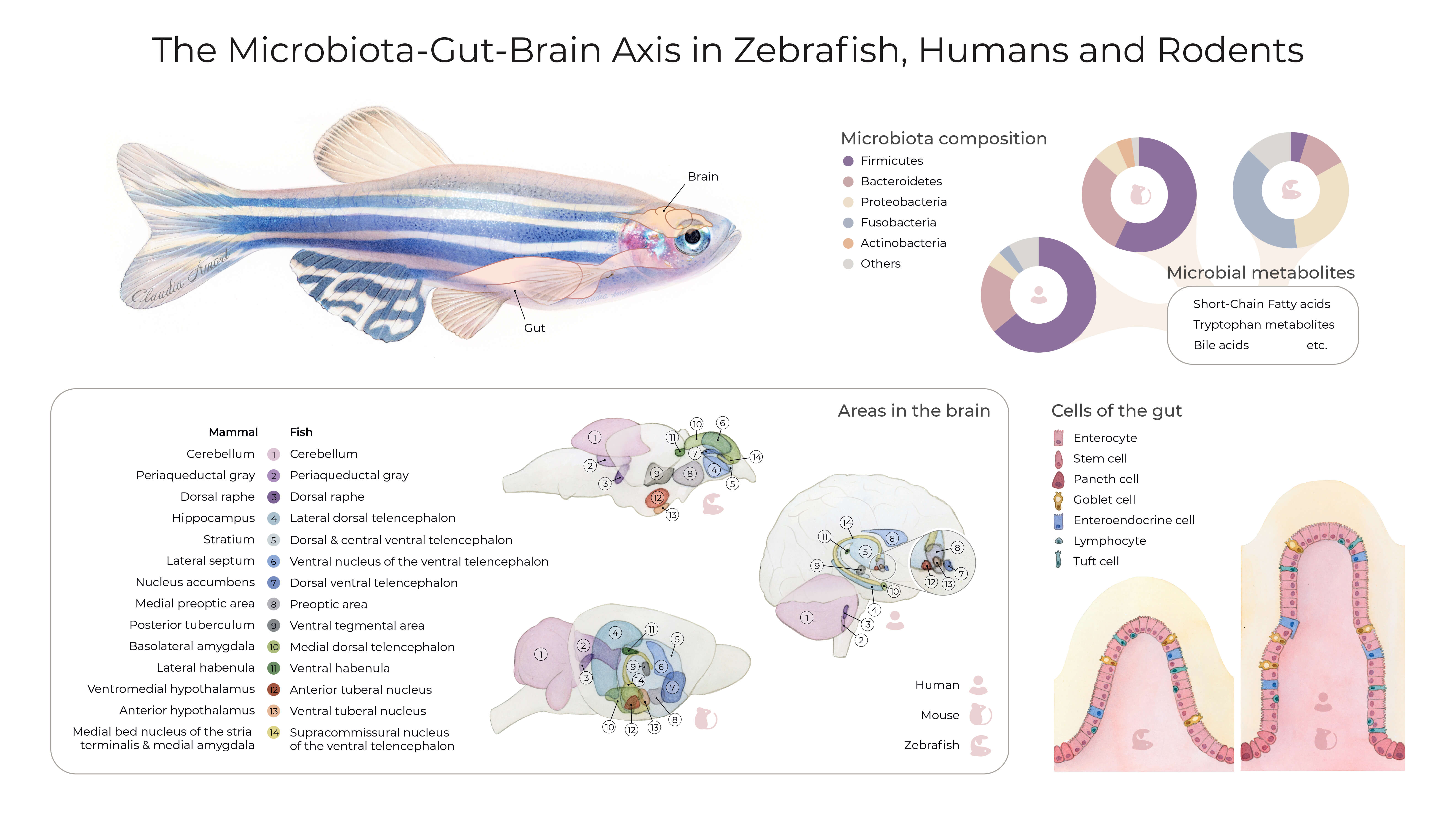 Das UCC - University College Cork, Irland, nutzte die Expertise von Amort für eine Illustration im Rahmen einer Publikation über den Vergleich der Mikrobiota-Darm-Hirn-Achse bei Zebrafisch, Mensch und Nagetier.