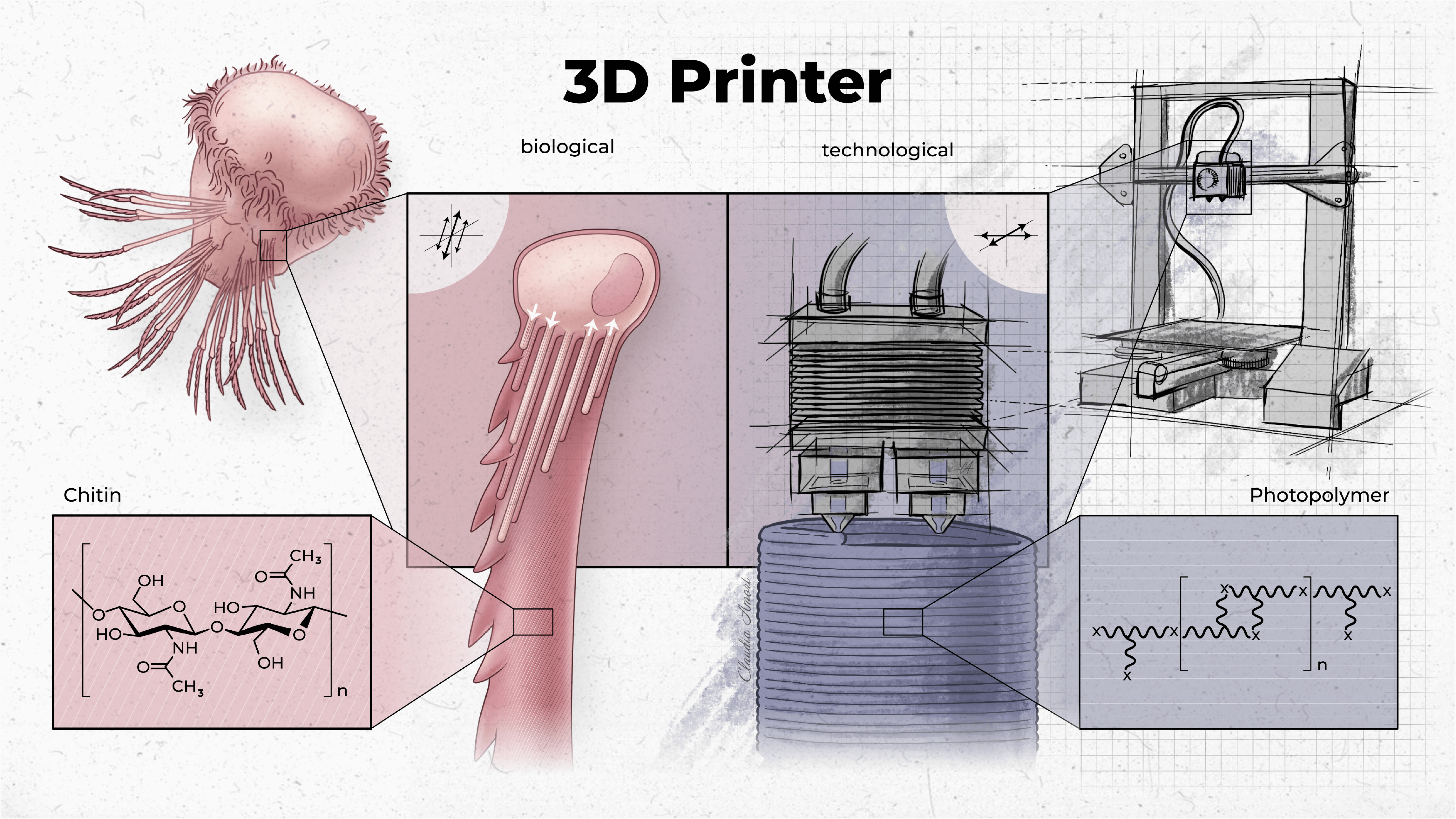 Mithilfe von Illustrationen lässt sich komplexe Information besser anveranschaulichen. Amort hat für die Universität Wien eine Infografik für einen Presseartikel zur Formation von Material bei einem Wurm im Vergleich zu einem 3D-Drucker erstellt.