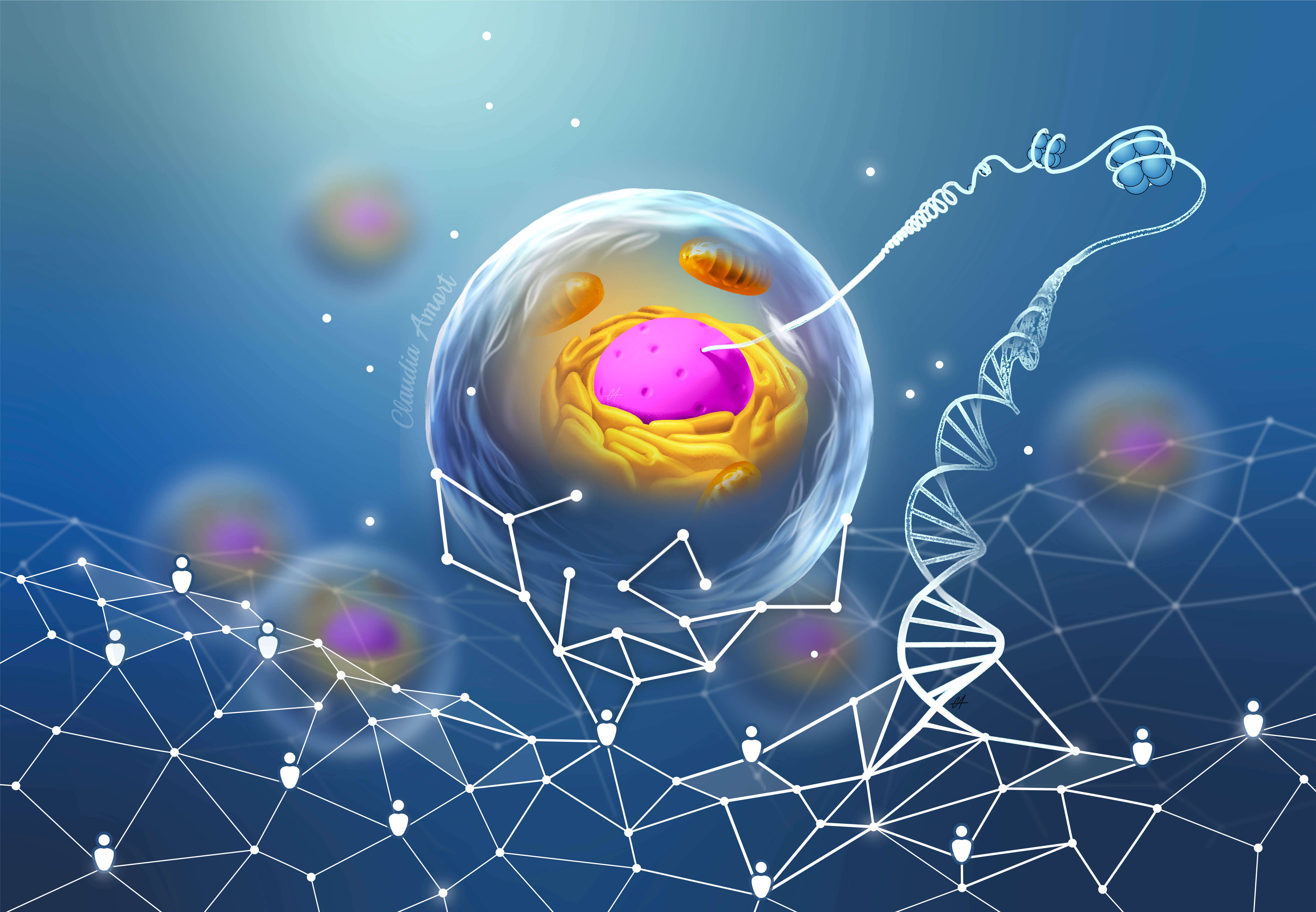 Für das Deutsche Krebsforschungsinstitut (DKFZ) erstellte Amort ein Hero-Bild für die Website einer Forschungsgruppe, das die zentralen Forschungsaspekte in der Genommedizin zusammenfasst.