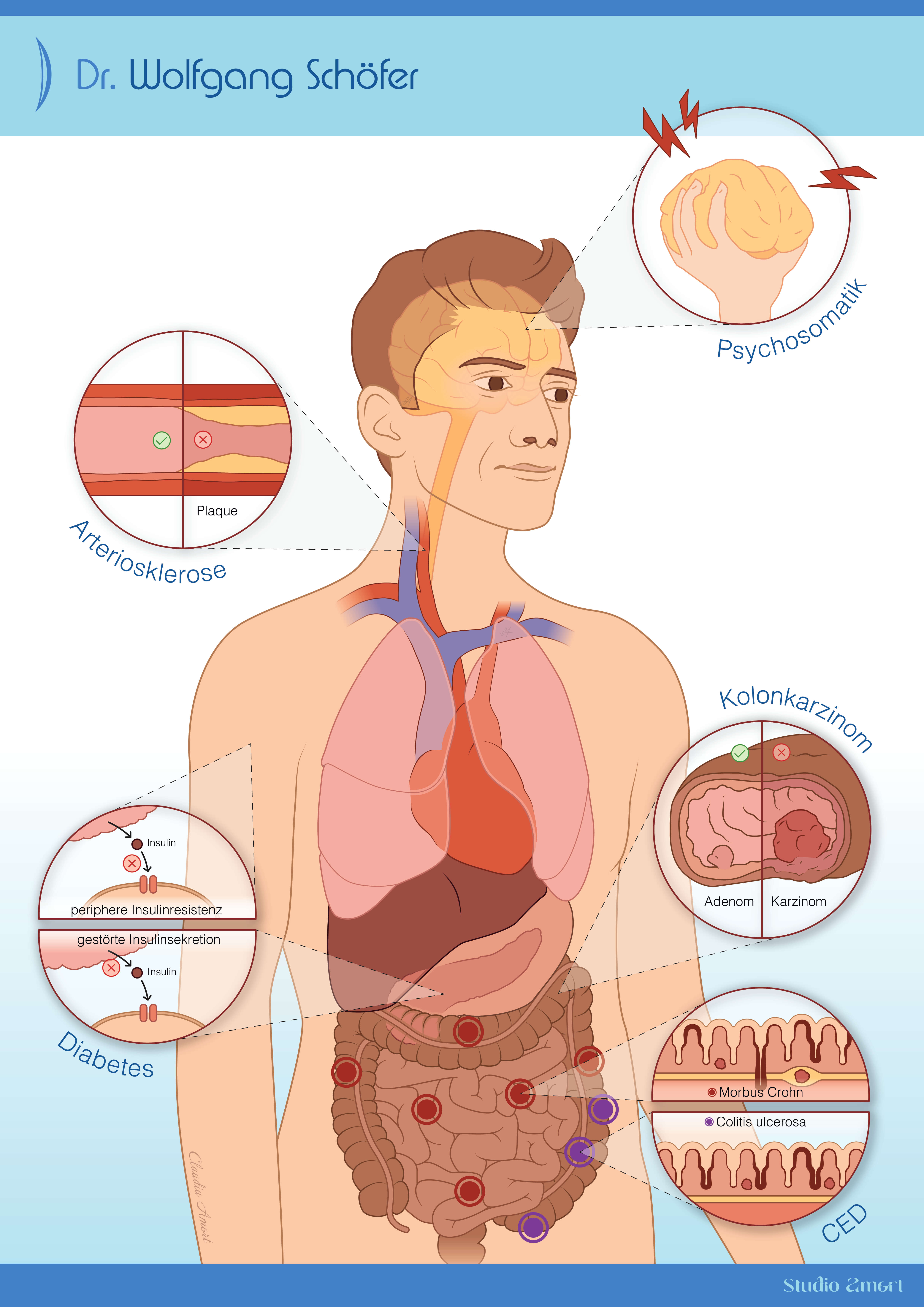 Das Poster entwarf Alumna Amort für einen Facharzt und dient der Aufklärung von Patienten über die häufigsten Erkrankungen in der Gastroenterologie.