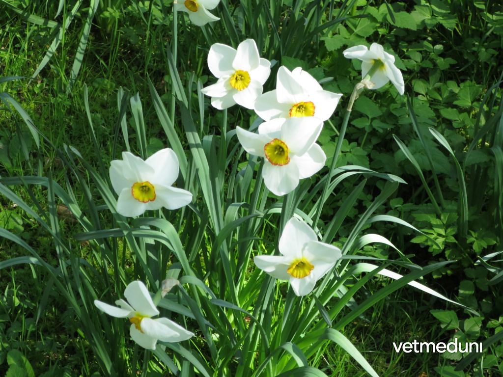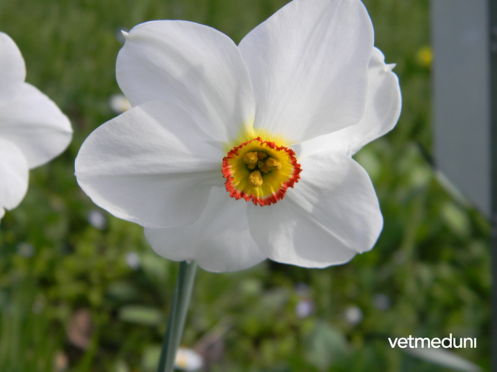 Beschreibung: Blüten 6-zählig, weiß, mit breiten Perigonblättern. In der Mitte ist eine kurze, gelb-rote Nebenkrone ausgebildet. Drei kurze und drei längere Staubblätter.