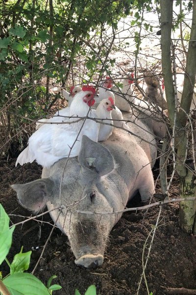 This picture was taken as part of the research project "Symbiotic pasture management of chickens and pigs to improve animal welfare".