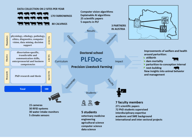 PLFDoc school https://www.vetmeduni.ac.at/plf-doc, funded by the Austrian Science Fund (FWF), aims to contribute to more sustainable production and animal welfare in agriculture in Austria and EU by applying modern data science techniques. PLFDoc school investigates application of computer vision (CV) technology for monitoring parturition in cows and pigs. Research focus within the PLFDoc is on application-oriented basic research, specifically on new methods of Explainable Artificial Intelligence (XAI), and CV for monitoring calving and farrowing. This will be a basis for development of new Precision Livestock Farming (PLF) management tools and intervention strategies in a period of parturition. The main aim of PLFDoc is to enhance animal welfare, e.g. through early detection of dystocia and preventing the death of newborns and their dams in this sensitive period and other health- and welfare-related risks. PLFDoc is a collaboration between Vetmeduni, Technical University Vienna and Univesrity of Applied Science Upper Austria.