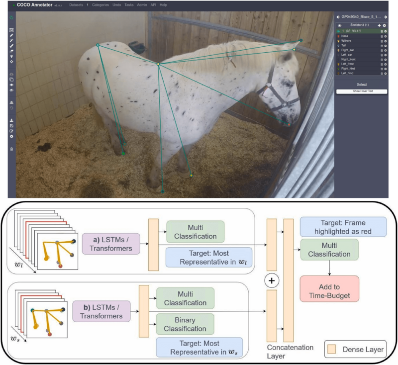 This proejct funded by Vetmeduni focuses on classification of pain in horses based on automatically detected behavoioural chenges. Specifically it focuses on the behavioural time budget of a horse consists i.e. amount of time of the activities such as feeding, resting, lying, and moving, which are important indicators of welfare and can be a basis of pain detection. Video technology offers a non-invasive and continuous monitoring approach for automated detection of horse behaviours. This project proposes a multi-input, multi-output classification methodology to address the challenges of accurately detecting and classifying horse behaviours. The results demonstrate that the multi-input and multi-output Transformer model achieves the best performance in behaviour classification compared with single input and single output strategy. The proposed methodology provides a basis for detecting changes in behaviour time budgets related to pain and discomfort in horses, which can be valuable for monitoring and treating horse health problems.