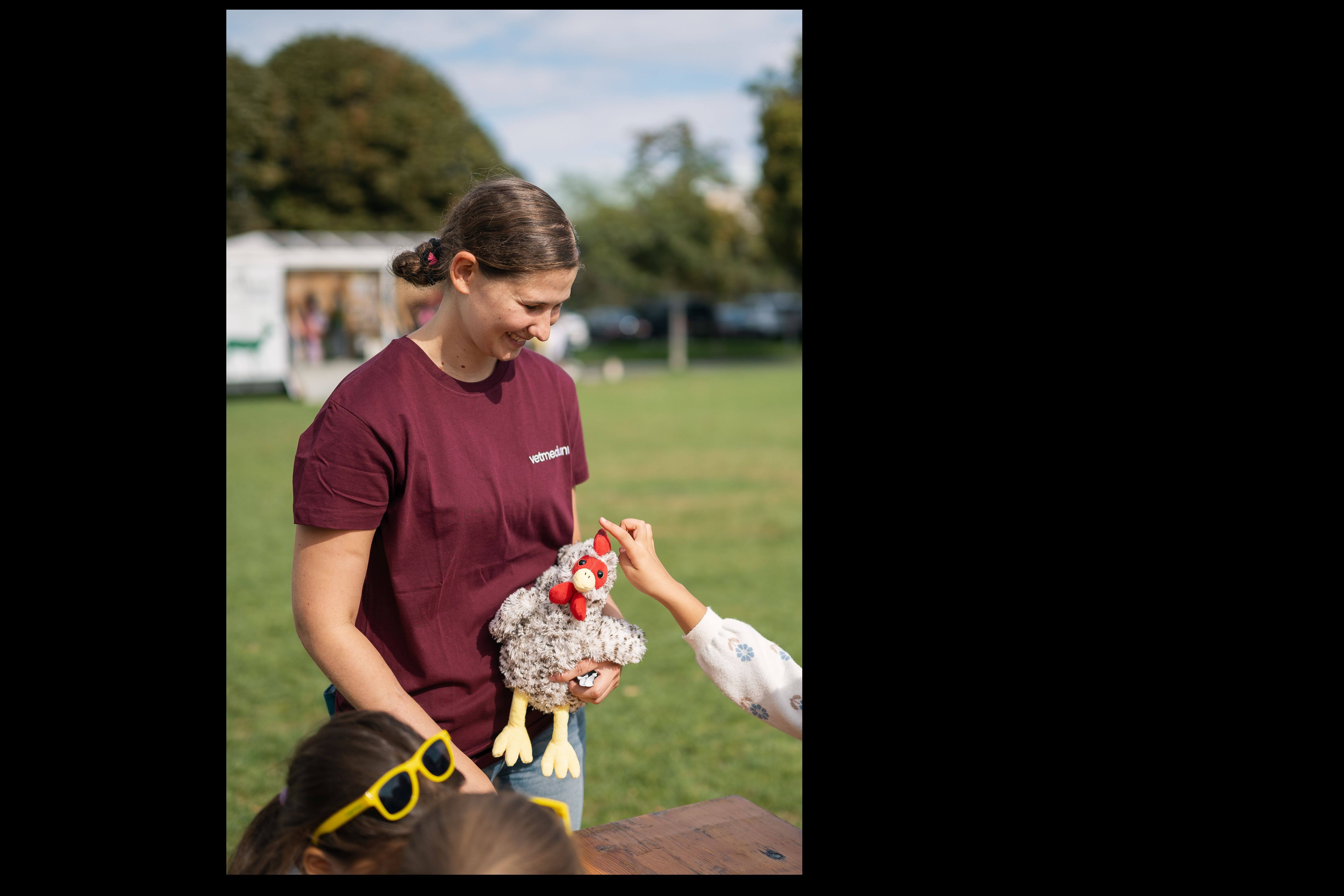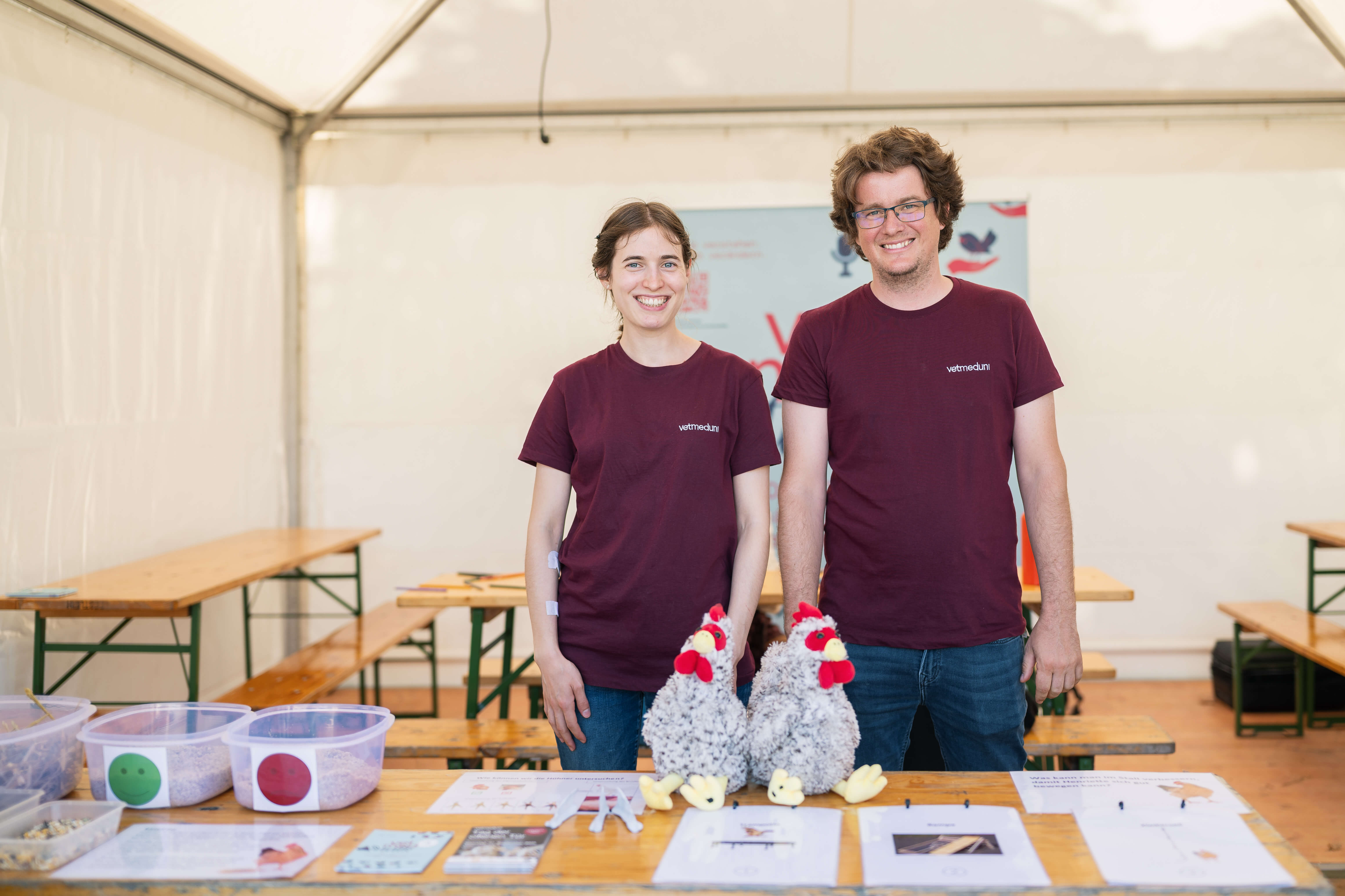 Im Zelt der Vetmeduni Wien konnten große und kleine Besucher:innen in die Welt des Huhns eintauchen: Einstreu ertasten, Futtermittel vergleichen, kreativ an der Malstation werden oder bei lustigen Ratespielen ihr Wissen testen. Ein besonderes Highlight war die geführte Untersuchung eines Plüschhuhns – hier wurde erklärt und ausprobiert, wie Tierärzt:innen bei echten Hühnern vorgehen.