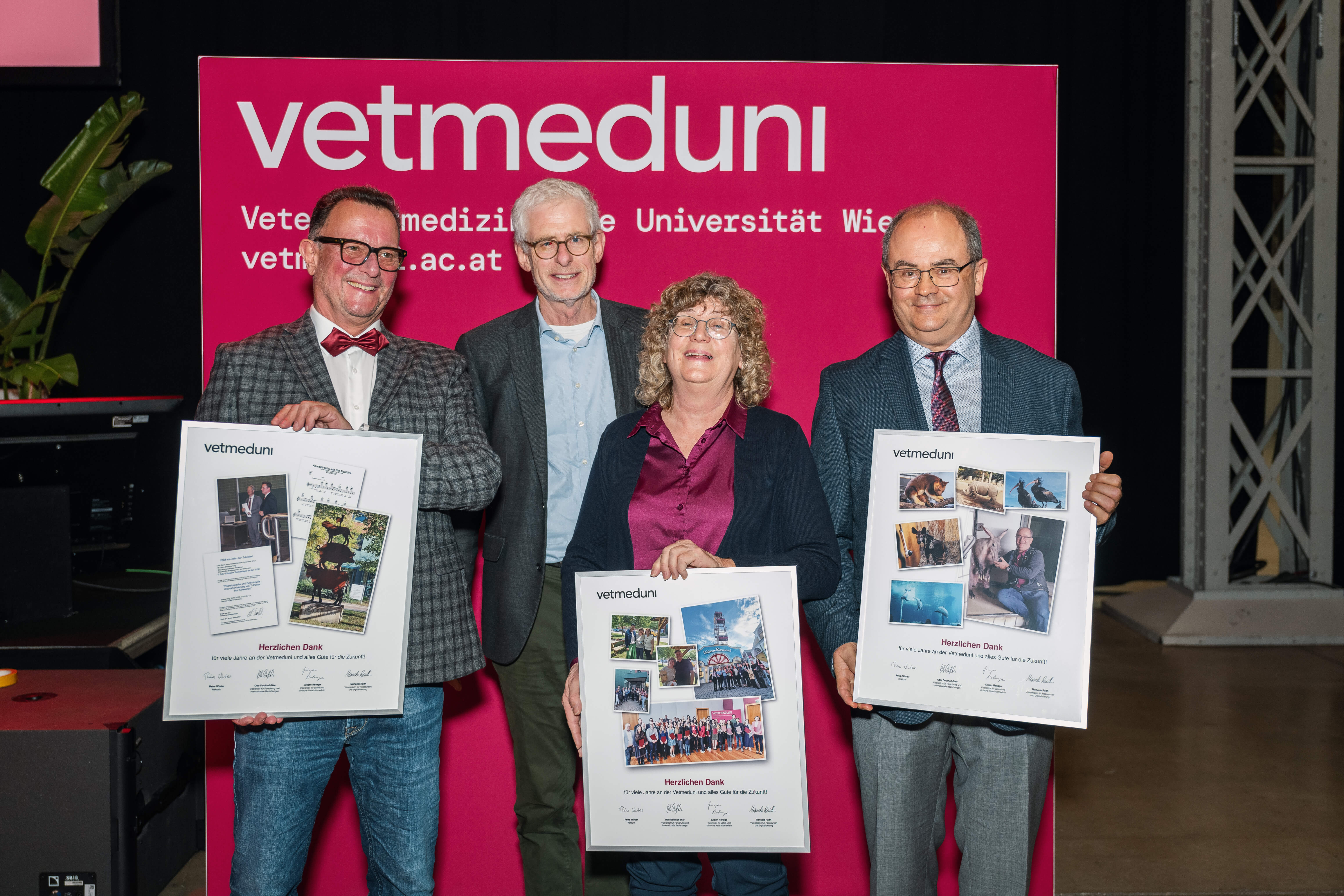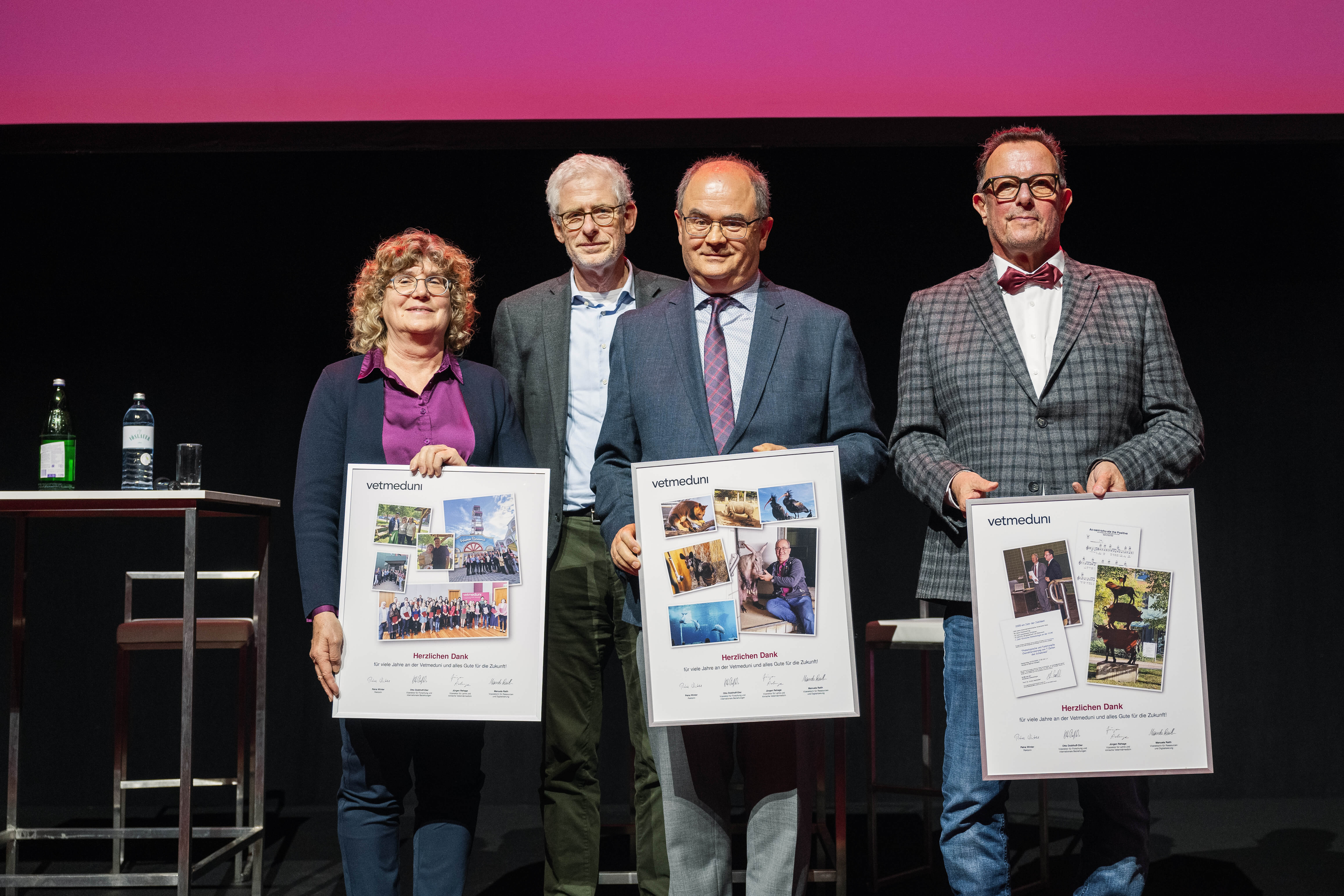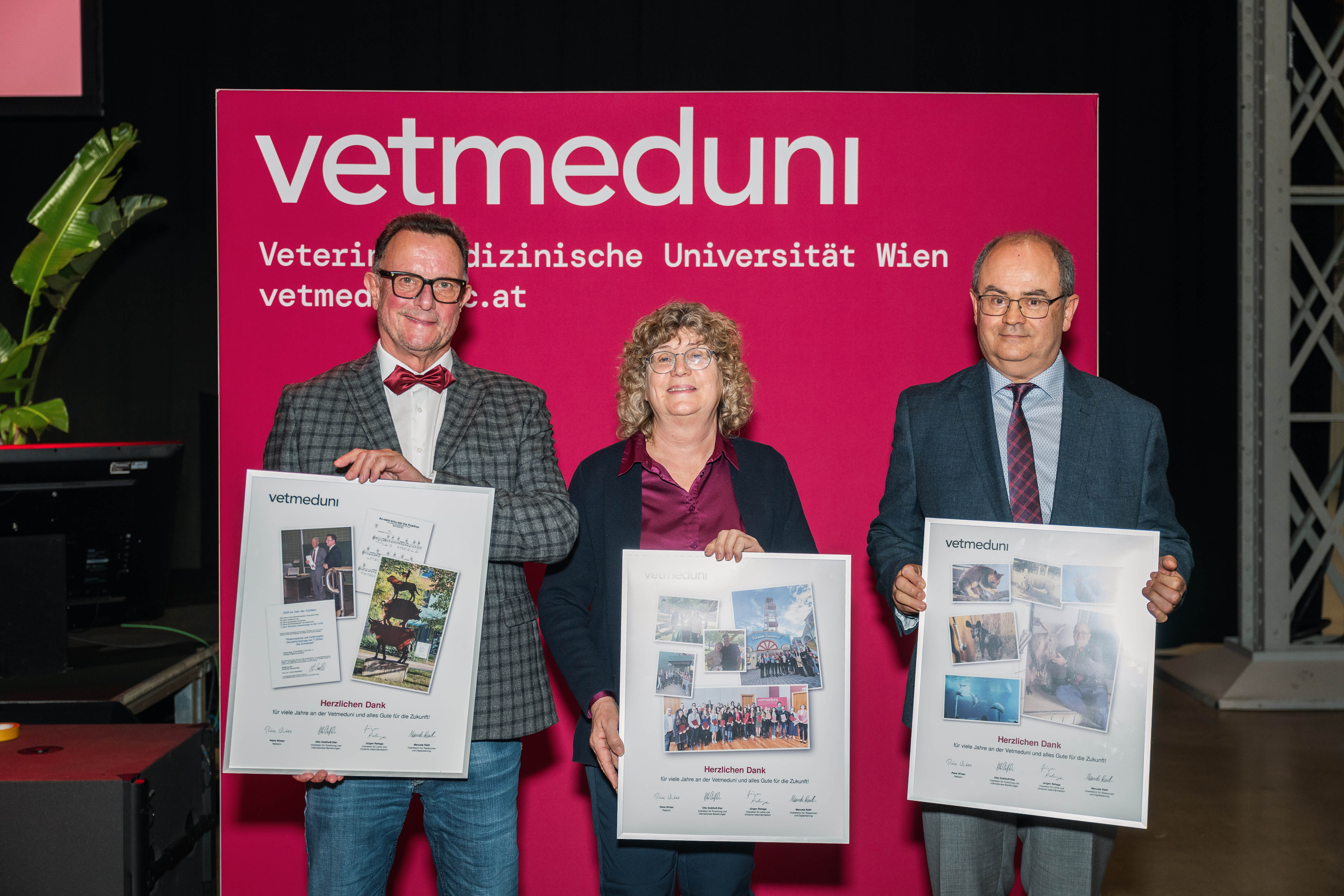 Mit „Adieu mit Applaus“ wurde ein Veranstaltungsformat ins Leben gerufen, das allen Professor:innen, die im jeweiligen Jahr in den Ruhestand treten, die Möglichkeit bietet, sich von Kolleg:innen und wichtigen Wegbegleiter:innen zu verabschieden. Gleichzeitig kann sich das Rektorat bei allen Eingeladenen für ihre langjährigen Dienste an der Vetmeduni herzlich bedanken. Heuer wurden Annemarie Käsbohrer (Zentrum für Lebensmittelwissenschaften und Öffentliches Veterinärwesen), Armin Saalmüller (Zentrum für Pathobiologie) und Franz Schwarzenberger (Zentrum für Biologische Wissenschaften) feierlich verabschiedet.