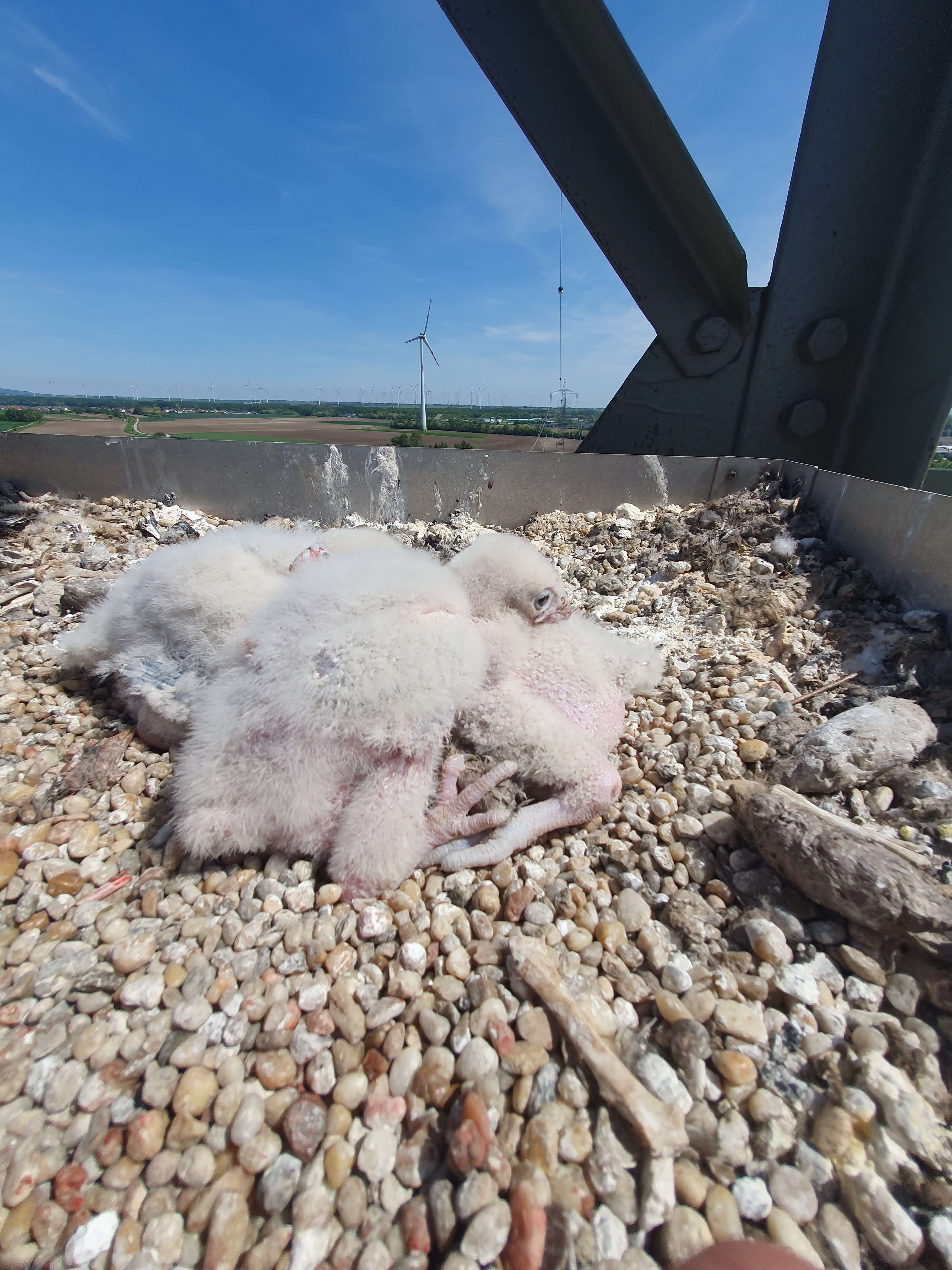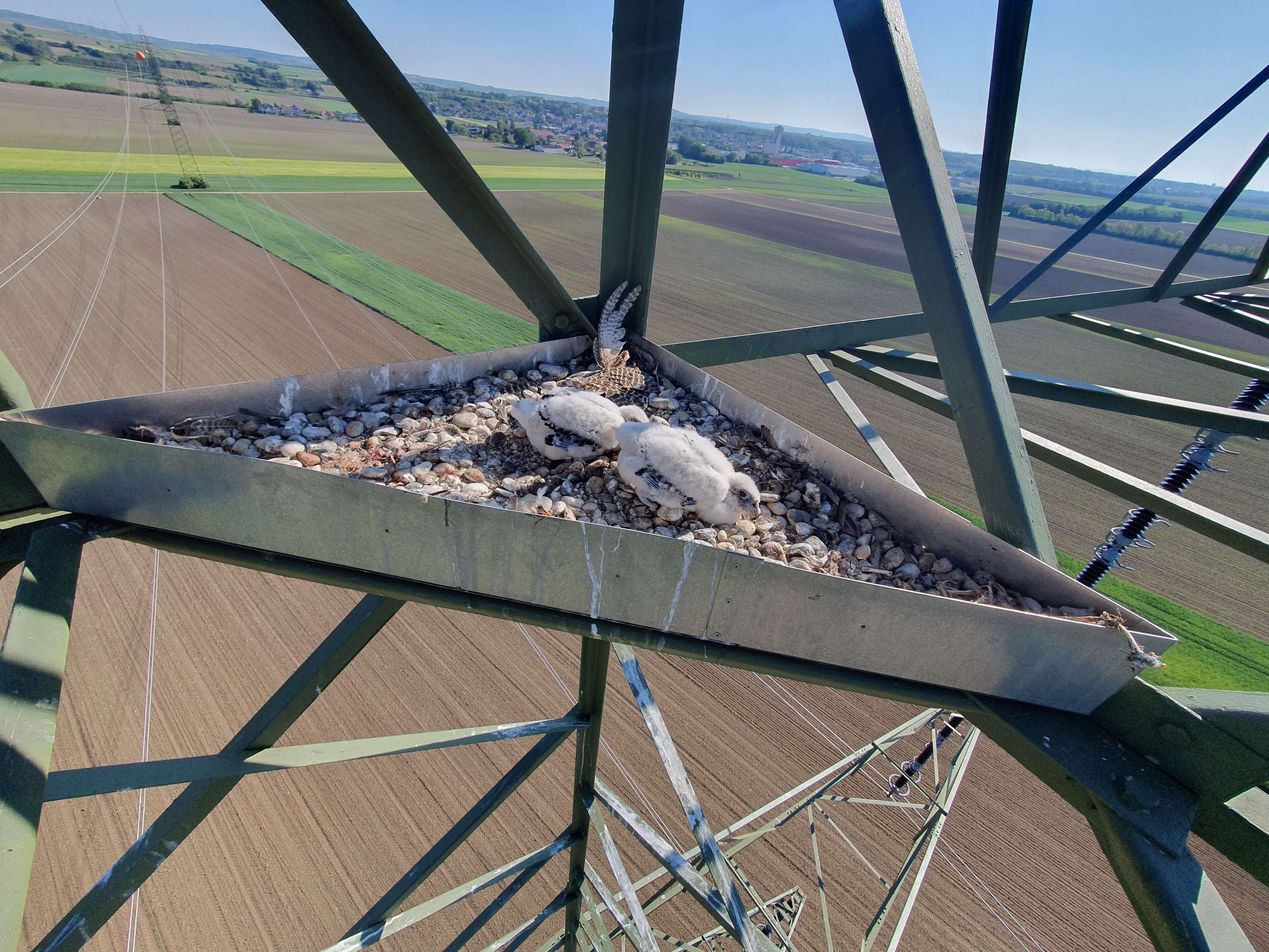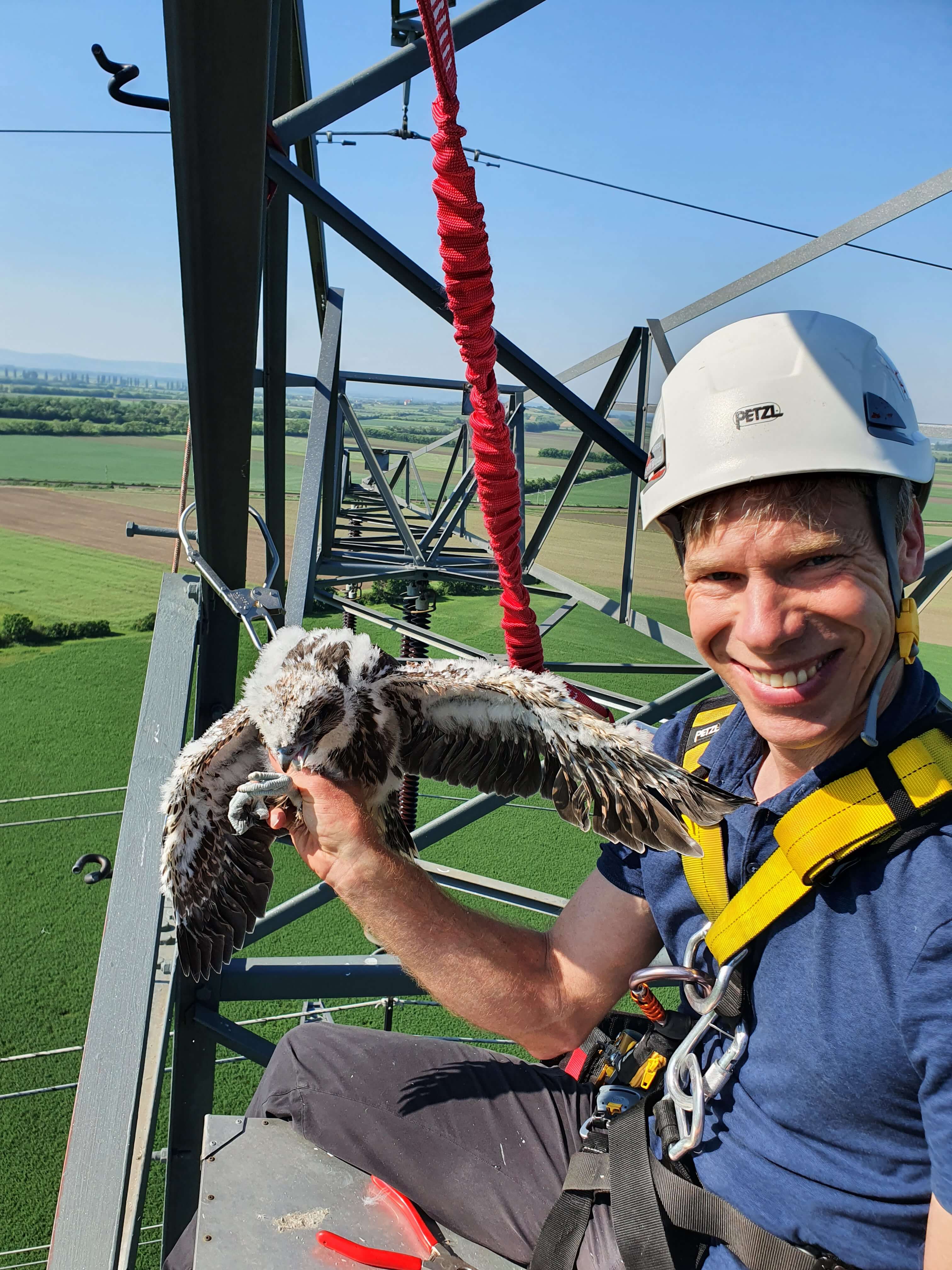 Richard Zink bei der Markierung eines drei Wochen alten Sakerfalken.