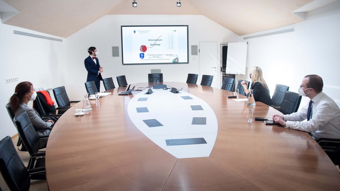 Am 3. Mai 2021 stellten Prof. Monika Ehling-Schulz und HptmdhmtD (Hauptmann des höheren militärtechnischen Dienstes) Maximilian Mayerhofer MSc. das Projekt EuroThrax im Bundesministerium für Landesverteidigung (BMLV) vor. Verteidigungsministerin Klaudia Tanner und Kabinettschef Dr. Arnold Kammel informierten sich eingehend über das Vorhaben und die geplanten Schritte. Frau Bundesministerin Klaudia Tanner begrüßt die Kooperation mit der Veterinärmedizinischen Universität Wien und sagte Ihre Unterstützung für das Projekt zu. Mit Blick auf die aktuellen Herausforderungen der COVID-19 Pandemie unterstrich Bundesministerin Klaudia Tanner die Wichtigkeit biologischer Forschung mit Wirkziel im In- und Ausland sowie die Vernetzung der akademischen Forschung mit öffentlichen Stellen.