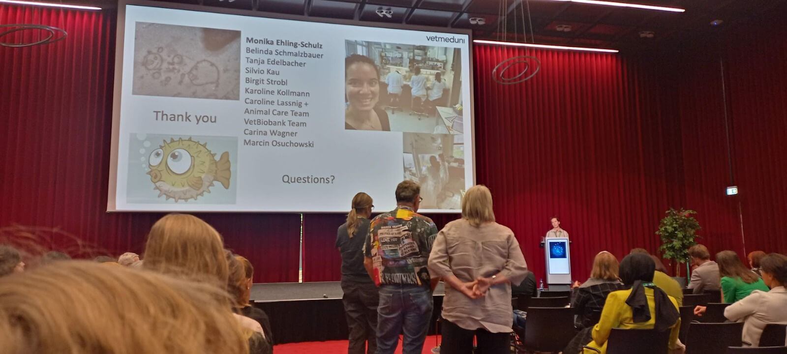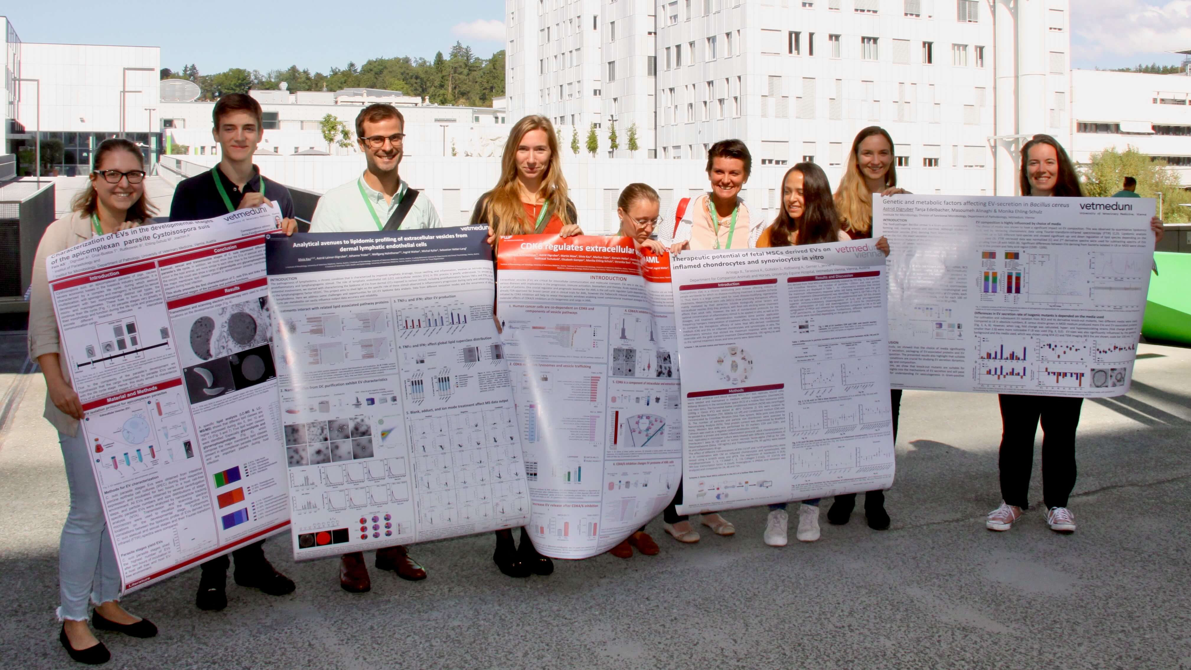 Für die Vetmeduni nahmen neben Silvio Kau vom Institut für Morphologie auch Astrid Laimer-Digruber und Tanja Edelbacher (Institut für Mikrobiologie), Belinda Schmalzbauer (Institut für Pharmakologie und Toxikologie), Anna Feix (Institut für Parasitologie), Iris Gerner, Karyna Tarasova und Belen Arteaga Paredes (VETERM Group), sowie Thomas Bargehr (Student) an der Tagung teil. Als Podiumsteilnehmerin sprach Astrid Laimer-Digruber über die Entschlüsselung des pathogenen und entzündungsfördernden Potenzials von extrazellulären Vesikeln, die von Bacillus cereus abgegeben werden. Silvio Kau wurde für seinen Beitrag zum Thema "Analytical avenues to lipidomic profiling of extracellular vesicles from dermal lymphatic endothelial cells" mit dem Posterpreis ausgezeichnet. Insgesamt wurden fünf wissenschaftliche Poster seitens der Vetmeduni eingereicht.