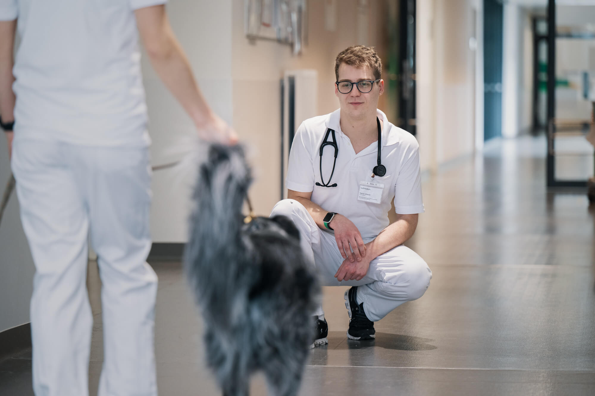 Egal, ob Studierende Dienst in den Ambulanzen, auf den Stationen oder im chirurgischen Bereich versehen: Von Beginn an sind sie mit der klinischen Praxis konfrontiert. „Wir nehmen bereits am Erstgespräch mit den Tierbesitzer:innen teil, sind in das Anamnesegespräch eingebunden und betreuen die Vierbeiner auf den Stationen. Dabei schauen wir den diensthabenden Tierärzt:innen, Residents und Fellows, die den potenziellen Nachwuchs unter ihre Fittiche nehmen, über die Schulter“, erzählt Viola Son. Sie ist als Studienassistentin im zehnten Semester in der Abteilung Interne Medizin Kleintiere tätig. Der Neubau der Kleintierklinik erlaubt nun eine noch intensivere Einbindung der Studierenden in die Praxis. Die Tierärzt:innen von morgen sind lückenlos bei allen Behandlungsschritten dabei und lernen so realitätsnah einen typischen tierärztlichen Arbeitsalltag kennen.