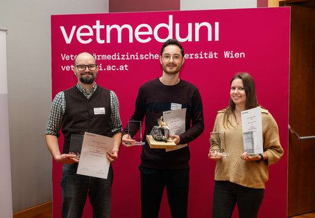 Jedes Jahr ehrt das Rektorat der Vetmeduni Mitarbeiter:innen und deren exzellente wissenschaftliche Leistung durch die Verleihung der Internen Wissenschaftspreise. Vergeben werden Auszeichnungen für die meisten Zitierungen in wissenschaftlichen Journals, für die höchste Drittmittelquote sowie für die Erfindung des Jahres. In der Unterkategorie „Nachwuchs“ werden Wissenschafter:innen ausgezeichnet, die jünger als 35 Jahre sind.
