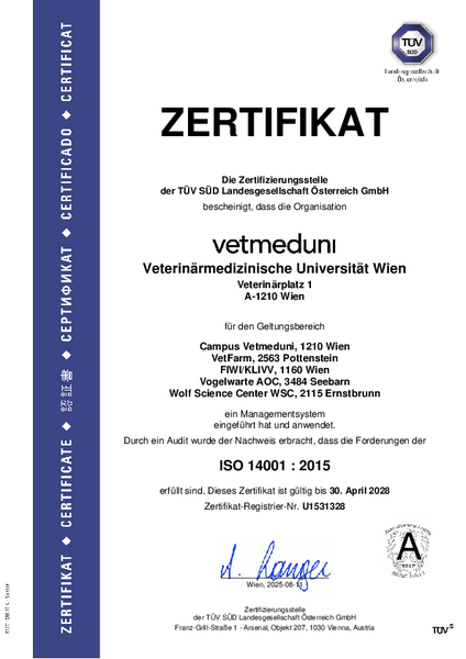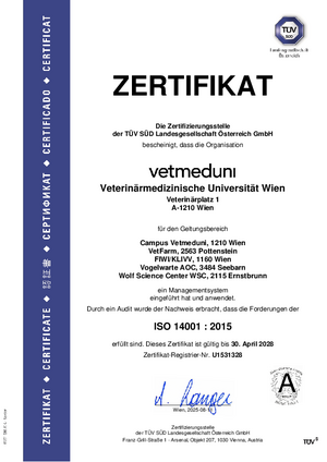 Seit 2019 ist die Vetmeduni nach EMAS und ISO 14001:2015 zertifiziert und unterzieht sich seither jährlich externen Audits. Diese regelmäßigen Überprüfungen sind ein zentraler Bestandteil des Umweltmanagementsystems der Universität, das darauf abzielt, Umweltbelastungen zu reduzieren, nachhaltige Strukturen zu fördern und die Einhaltung aller relevanten Umweltgesetze sicherzustellen. Darüber hinaus setzt sich die Vetmeduni freiwillig zusätzliche Umweltziele, um ihre Umweltleistung kontinuierlich zu verbessern.
