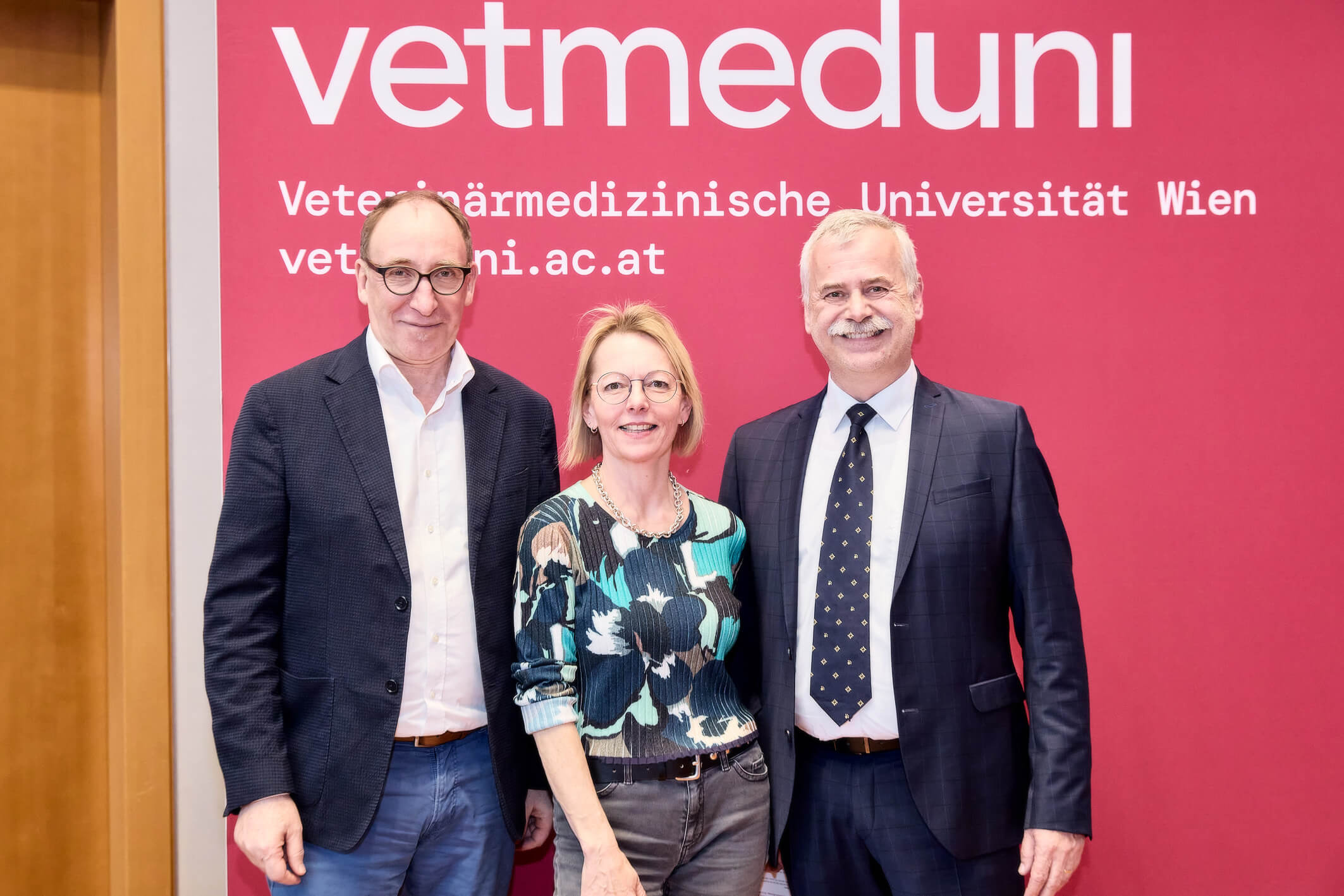 BM Johannes Rauch, Rektorin Petra Winter und Karl Weissenbacher, Leiter der Prüf- und Koordinierungsstelle für Assistenzhunde und Therapiebegleithunde.